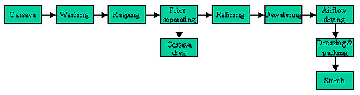 The production process of cassava flour mill plant includes: raw material washing, peeling, rough crushing, fine crushing, residue and starch slurry separation, starch slurry refining, dewatering, airflow drying, dressing and packaging.